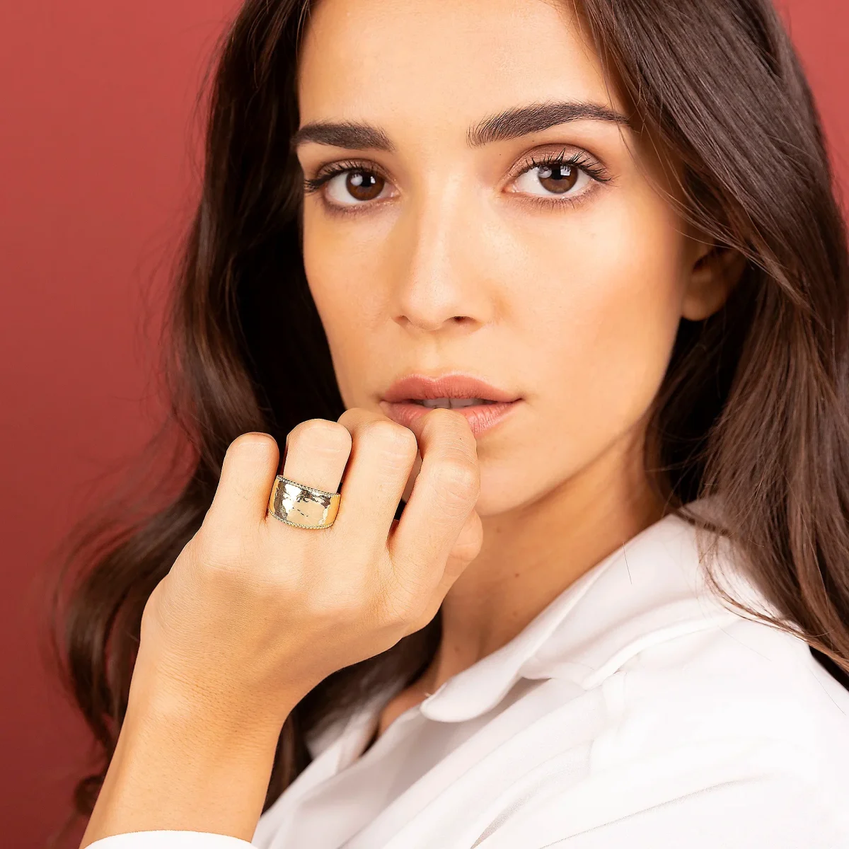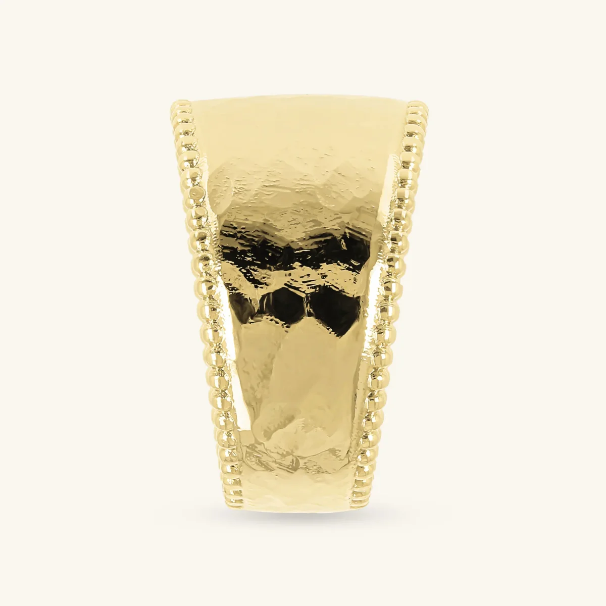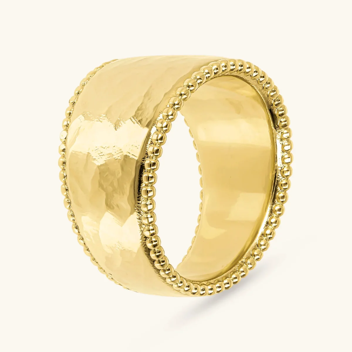 Anello a fascia graduato Etrusca Gioielli realizzato in lega Golden, placcata oro giallo 18kt, con superficie martellata e bordi impreziositi da piccole palline.