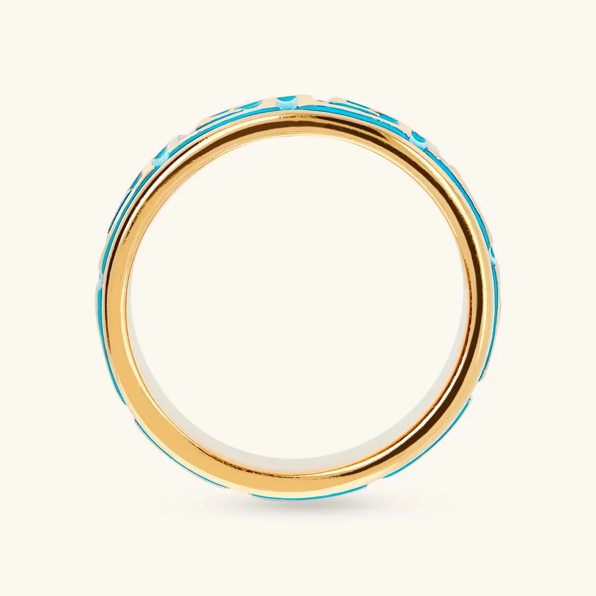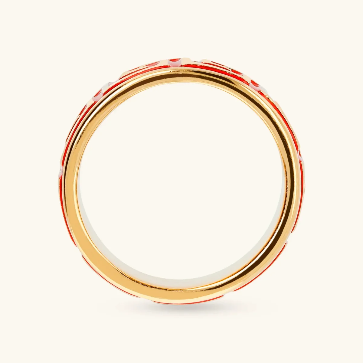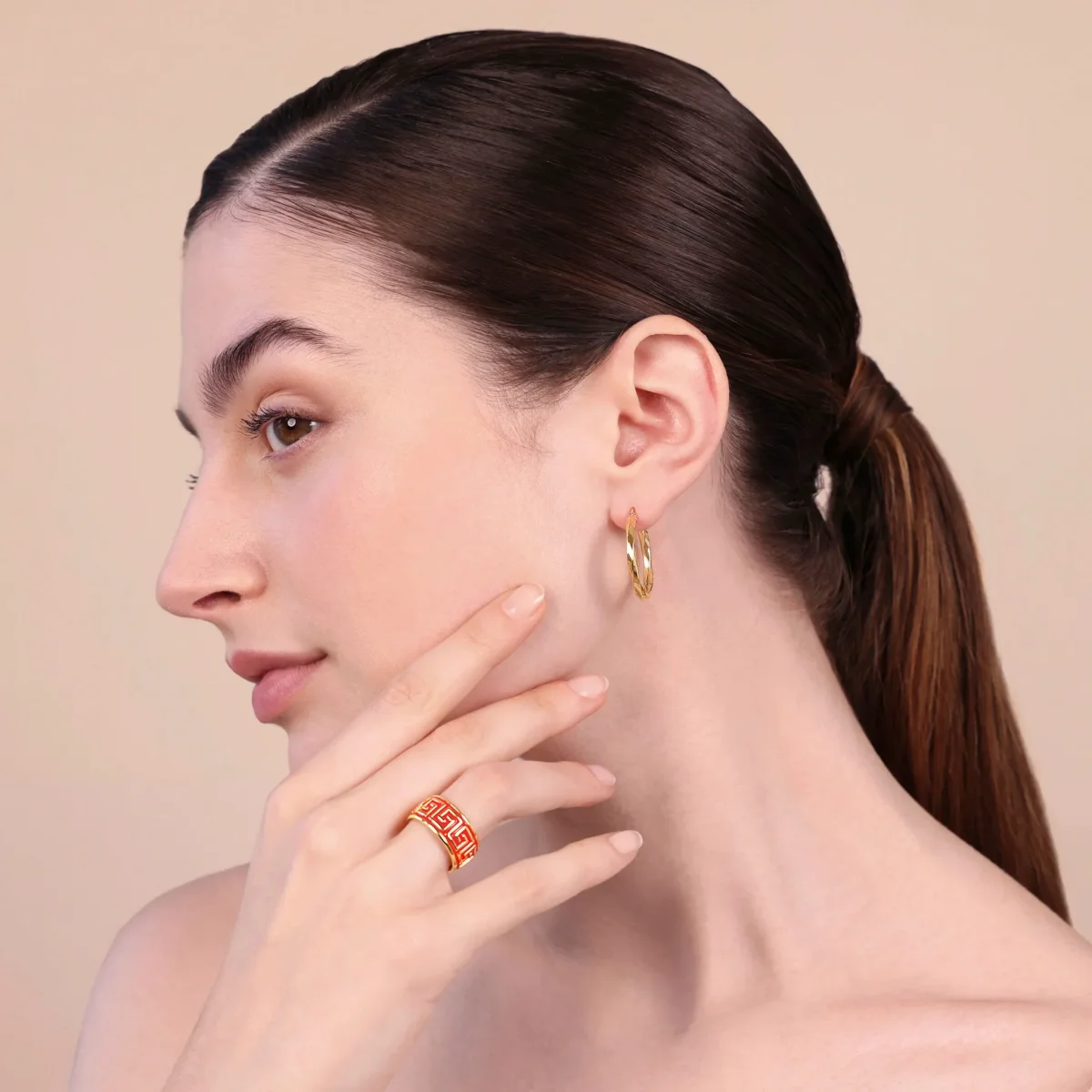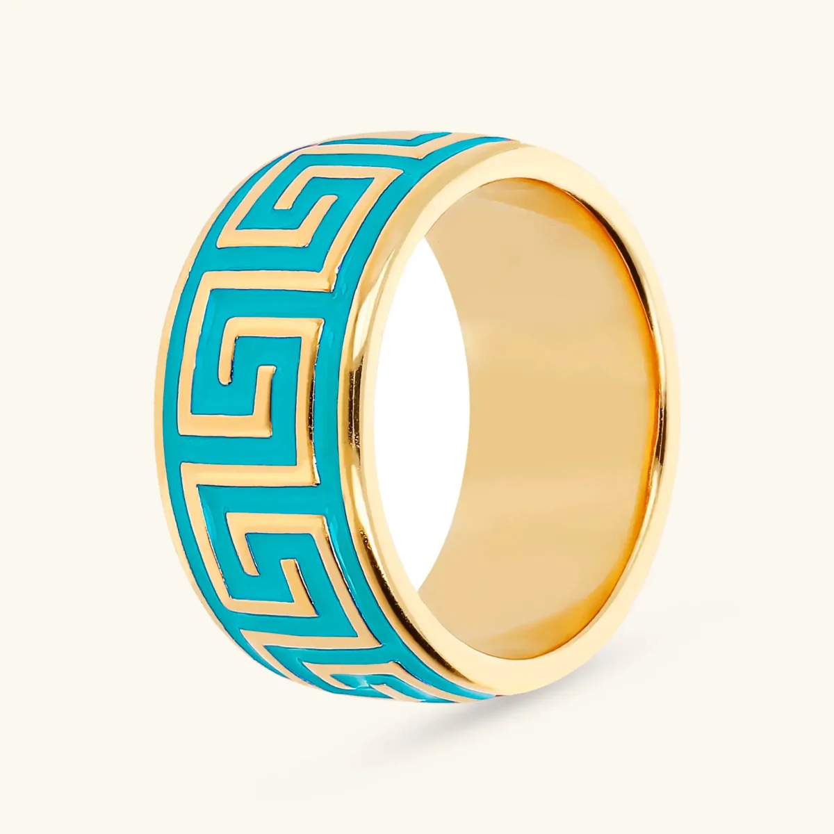 Anello a fascia Etrusca Gioielli realizzato in lega Golden, placcata oro giallo 18kt, smaltato e decorato con raffinate linee che ricreano una greca.