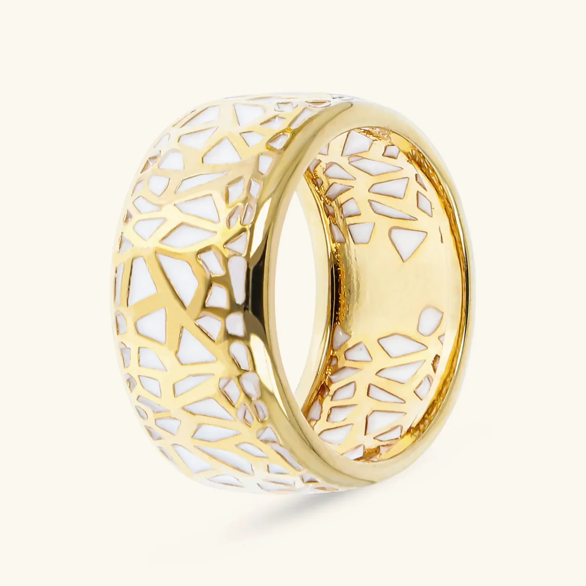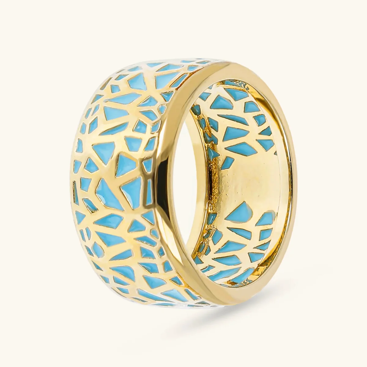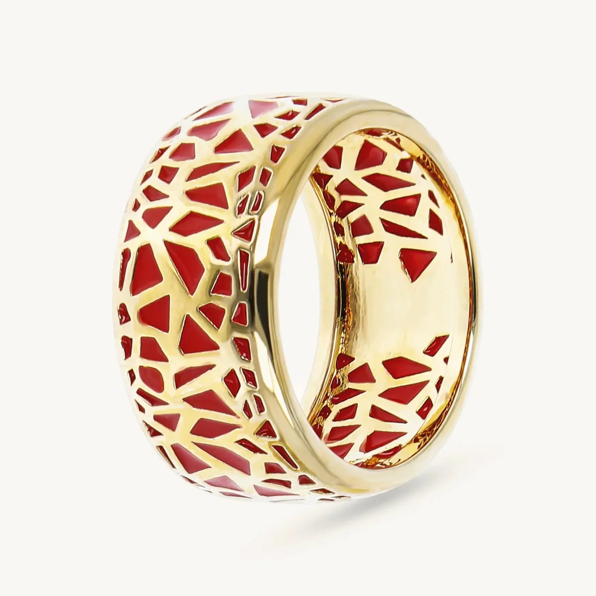 Anello a fascia Etrusca Gioielli realizzato in lega Golden, placcata oro giallo 18kt, dal design traforato con superficie smaltata di colore rosso, bianco o azzurro che richiama la tecnica del mosaico.