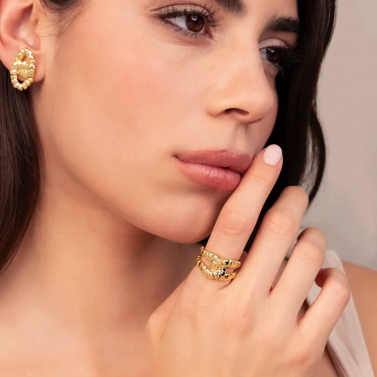 Anello a fascia Etrusca Gioielli realizzati in lega Golden, placcata Oro giallo 18kt, con elemento a nodo centrale e finitura a corda.