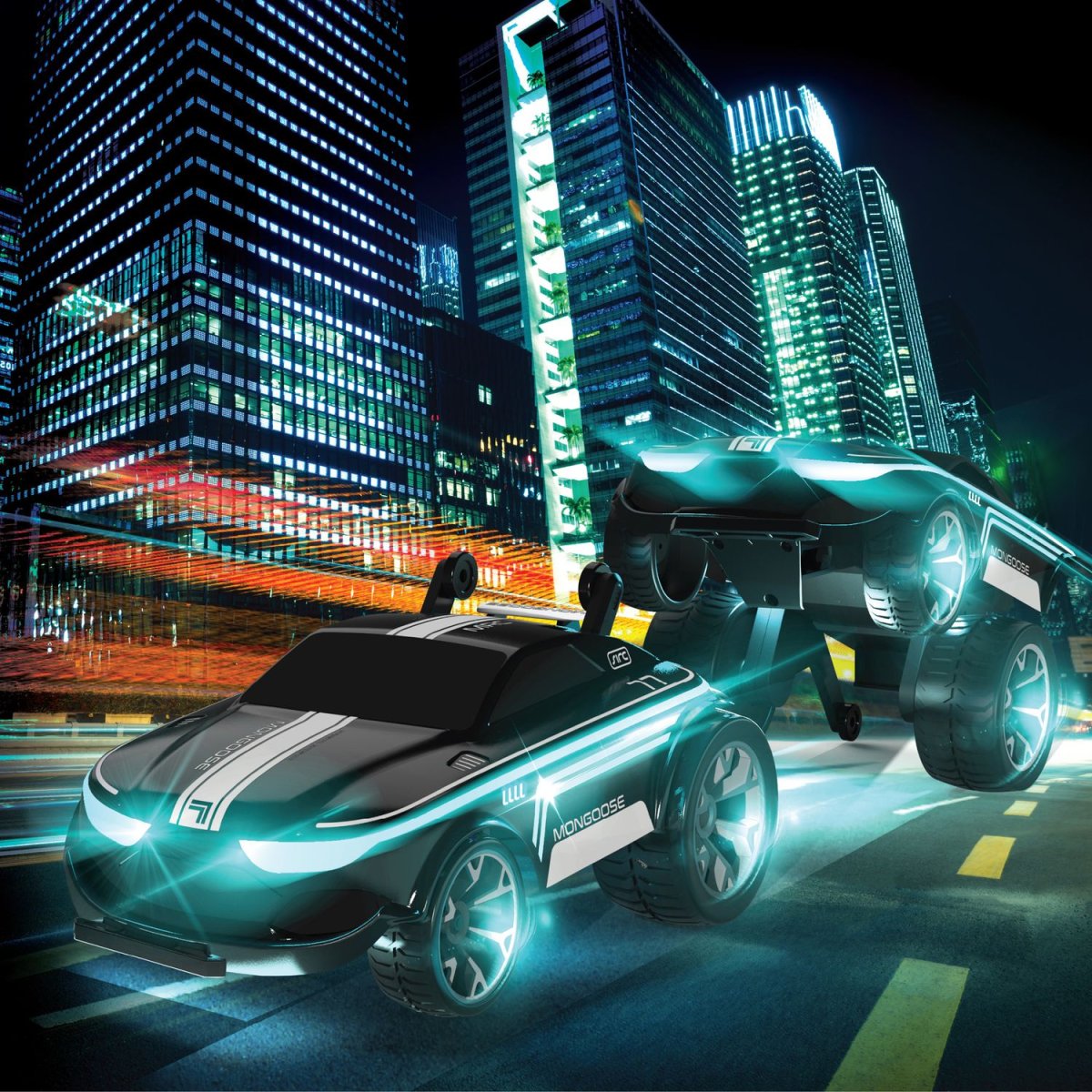 Illumina la notte con la tua macchinina radiocomandata Stunt Mongoose, grazie alle sue luci a LED presenti sulla carrozzeria. Potrete raggiungere velocità elevate su rettilinei e curve, grazie ai grandi pneumatici ad elevata aderenza: nessun percorso sarà più un ostacolo!