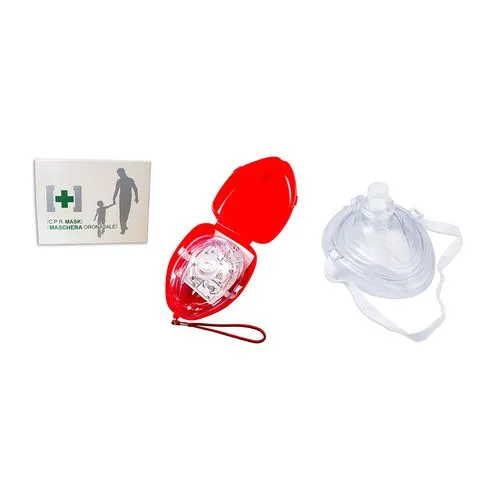Maschera con bordo pneumatico per la rianimazione bocca bocca. Dotata di valvola unidirezionale e attacco per connessione ossigeno. Fornita con custodia in polipropilene.