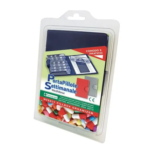 Indicato per una comoda e pratica organizzazione settimanale delle pillole. Un valido supporto per essere precisi durante la terapia domiciliare. Contiene 7 portapillole giornalieri dotati di 3 pareti divisorie regolabili e 4 scomparti MATTINO, MEZZOGIORNO, SERA, NOTTE, per consentire il caricamento anche di pillole più grandi. Scheda individuale riepilogativa della terapia farmacologica inserita in ogni dispenser. Latex Free.