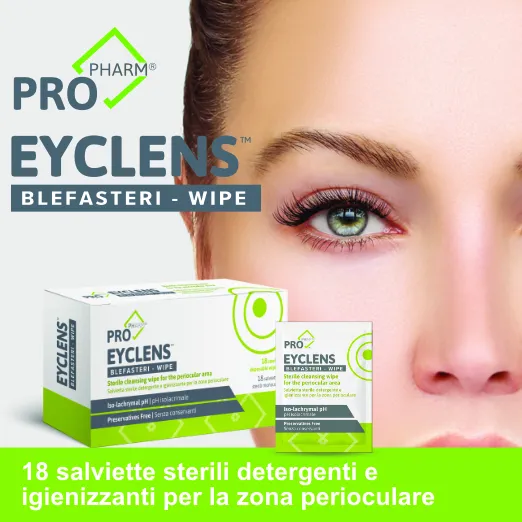 La gamma completa comprende le Salviette sterili per la detersione e l’igiene quotidiana perioculare, con Acido Ipocloroso, lo Spray oculare e Eyclens Blefasteri Wipe – Salvietta sterile a pH isolacrimale