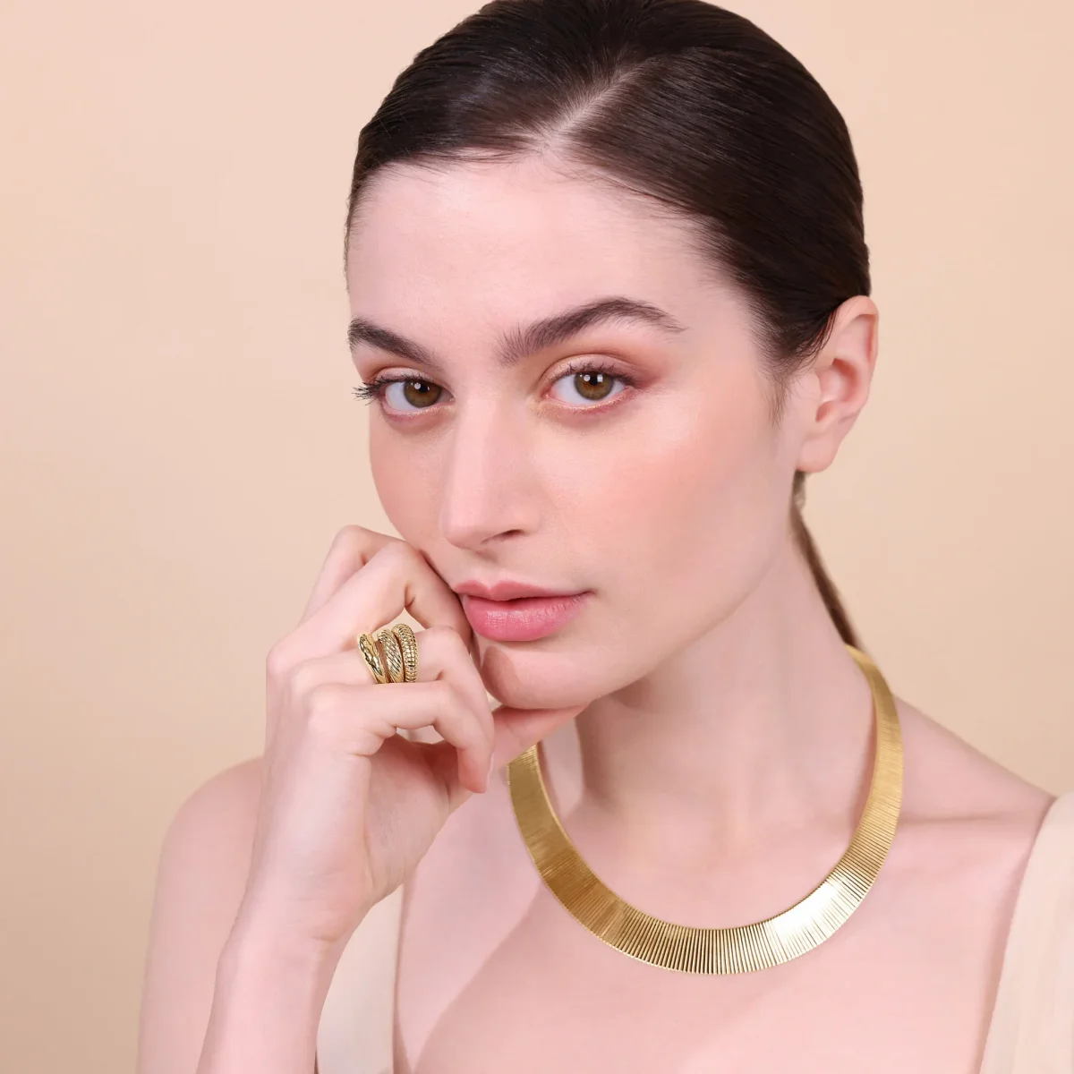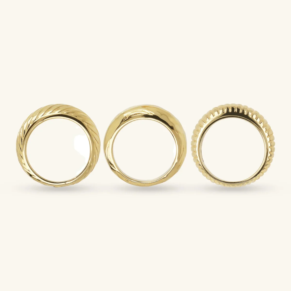 Set di anelli Etrusca Gioielli realizzati in lega Golden, placcata oro giallo 18kt, composto da una fedina con superficie delicatamente martellata, una fedina con texture a righe verticali e una fedina con texture a righe oblique.